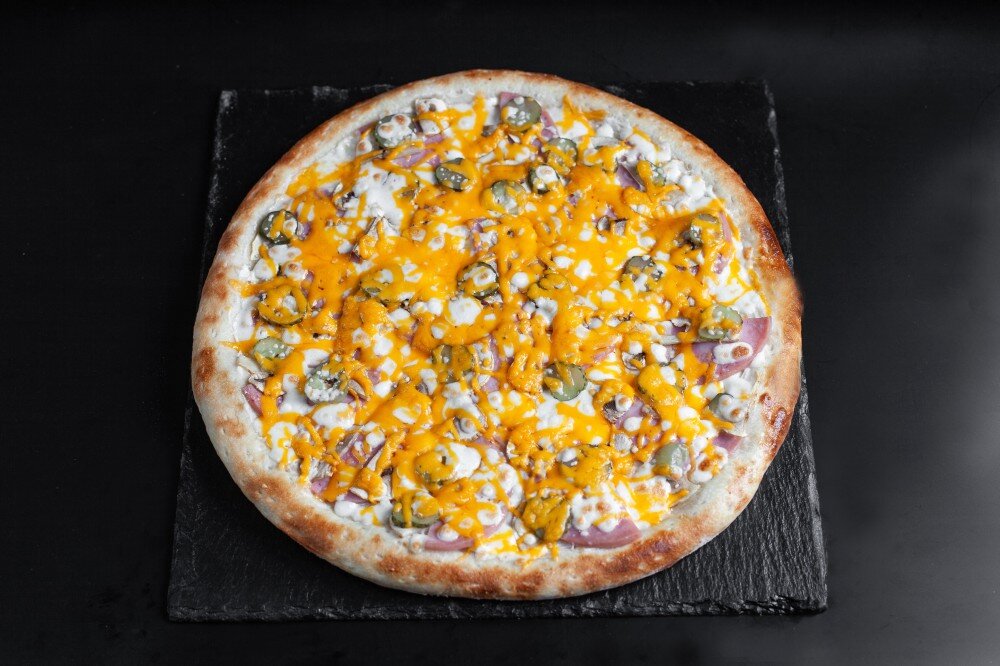 Тесто, соус белый, шампиньоны, ветчина, корнишоны, сыр моцарелла, сыр чеддер