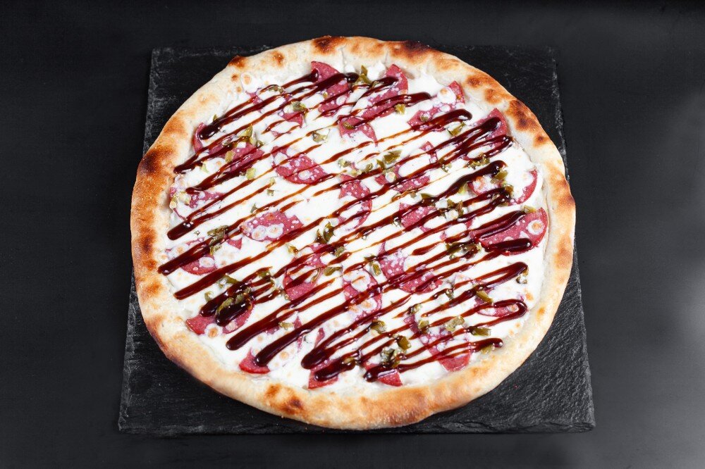 Тесто, соус белый, сервелат, шампиньоны, халопеньо, сыр моцарелла, барбекю соус